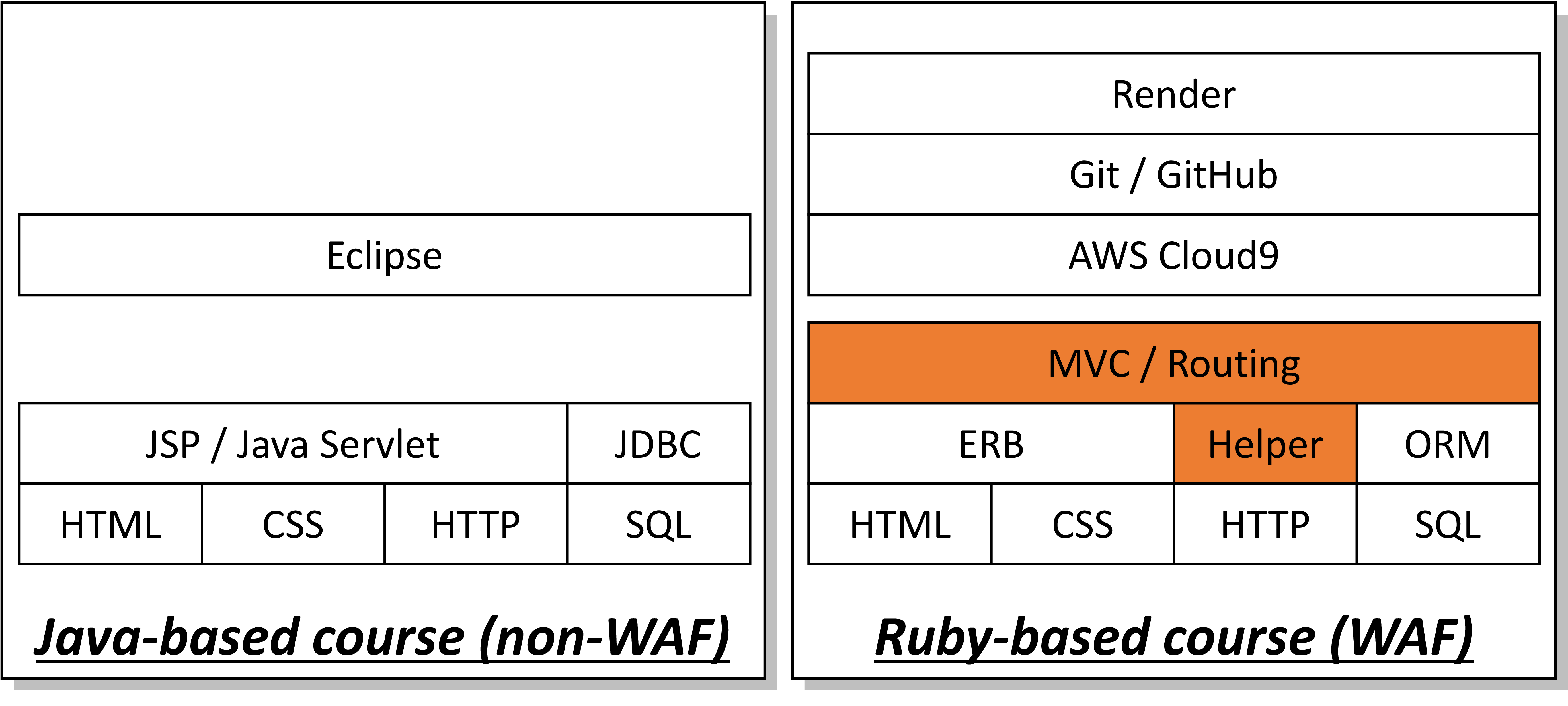 This study presents a comparative case study of the evolution of a software development course at Kindai University. We analyze two distinct pedagogical ecosystems: a traditional course based on Java Servlet/JSP with a local integrated development environment (IDE), and its subsequent iteration, a modern course employing the Ruby on Rails framework (a Web Application Framework, or WAF), Git for version control, a cloud-based IDE, and Platform as a Service (PaaS) for deployment. This study was not a controlled experiment isolating the effects of a WAF but rather an exploratory analysis of how a shift in the entire toolchain impacted student outcomes and perceptions. Quantitative analyses of student projects over three years for each course revealed that the modern Ruby-based ecosystem resulted in applications with approximately 50% more screens and screen transitions, despite requiring approximately 40% less source code. Furthermore, student surveys indicated significantly higher comprehension and interest in the modern courses. However, the number of data models and user stories remained consistent, suggesting that upstream design thinking was less affected by the technology stack. These findings suggest that adopting a modern, integrated development ecosystem can foster a more productive and engaging learning experience. We conclude by discussing the implications of these findings for curriculum design, emphasizing the value of incorporating contemporary, industry-aligned toolchains into software engineering education, while acknowledging that the observed benefits stem from the synergistic effect of multiple technologies rather than from a single component.